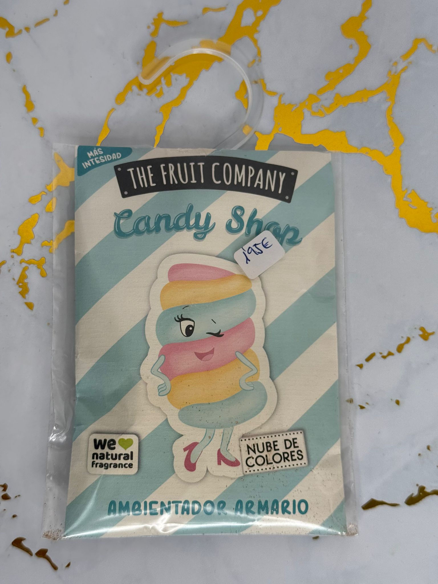 Ambientador de armario The Fruit Company – Candy Shop con diseño divertido y colorido en forma de nube sonriente. Está elaborado con fragancias naturales y pensado para aportar un aroma duradero e intenso en espacios pequeños como armarios, cajones o estancias cerradas.