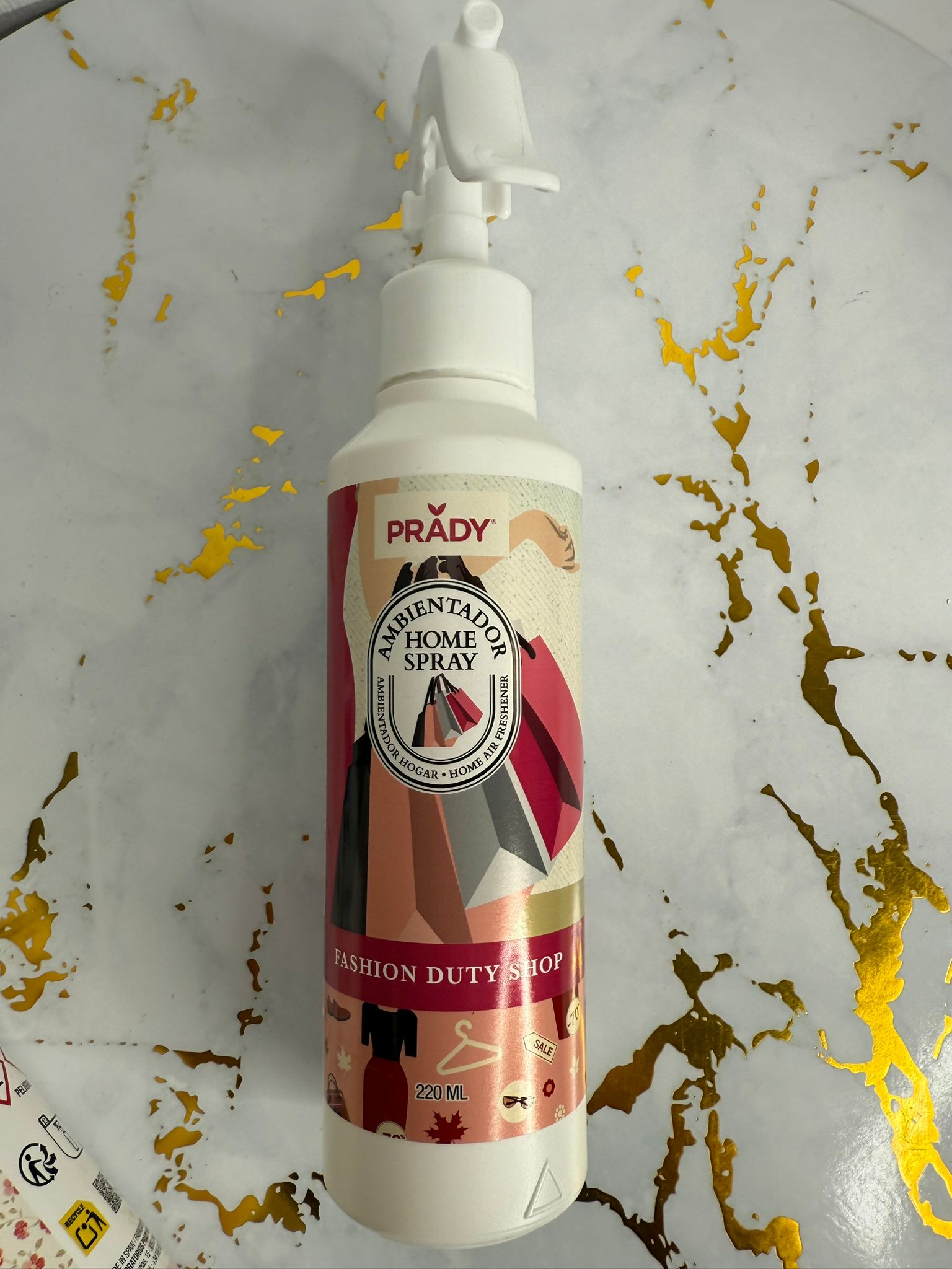 El producto de la imagen es un ambientador en spray para el hogar de la marca PRADY, con la fragancia Fashion Duty Shop.