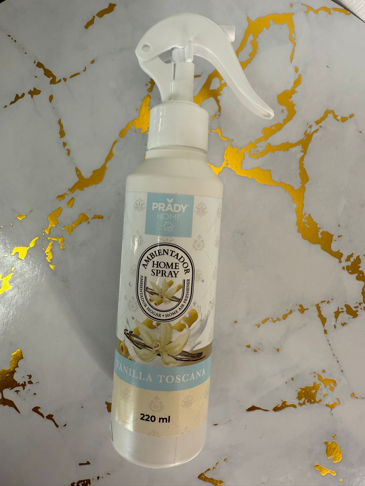El producto en la imagen es un ambientador en formato spray para el hogar, con el aroma "Vanilla Toscana" de la marca Prady. 220ml