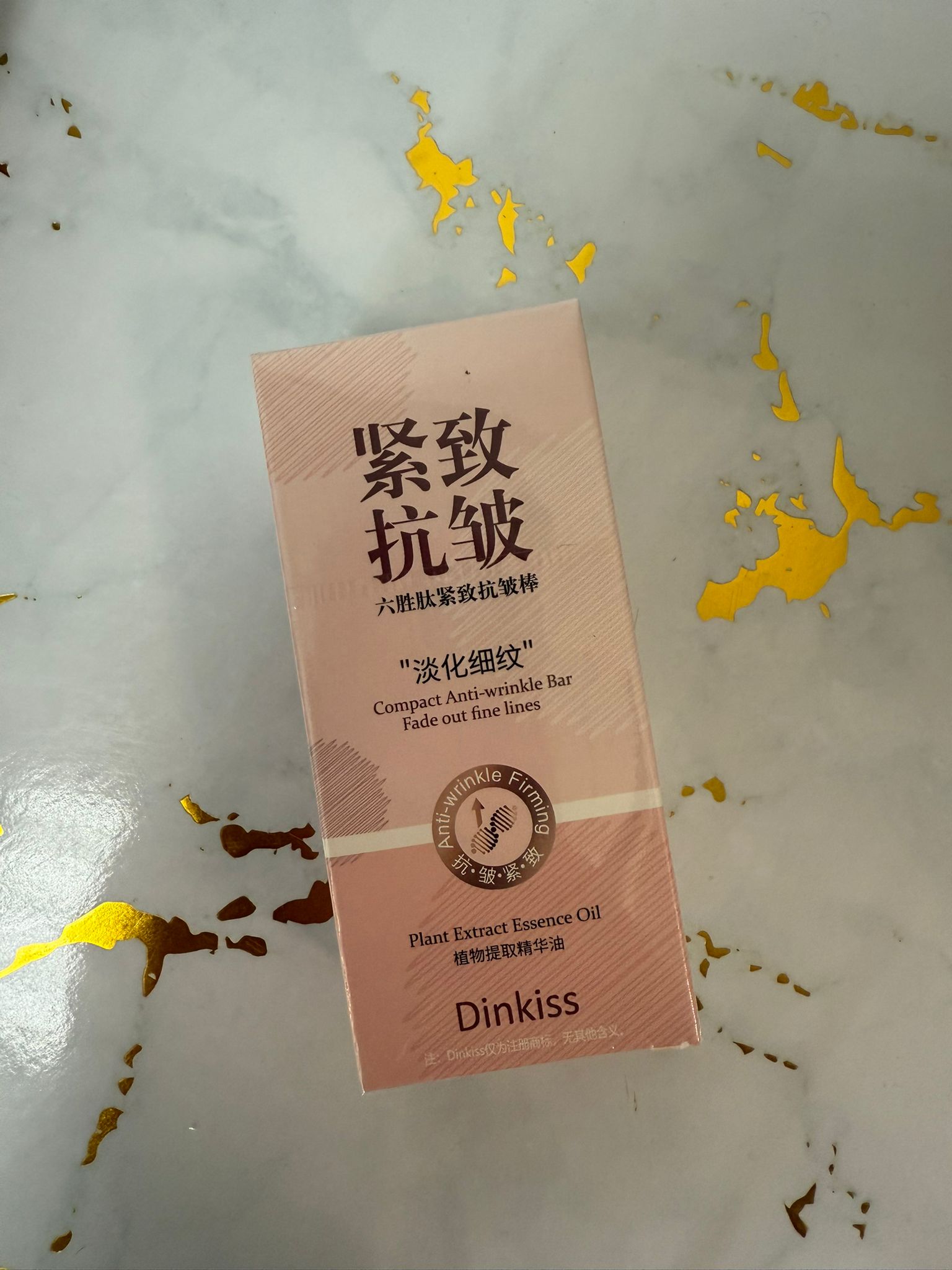 El producto en la imagen es una barra compacta antiarrugas de la marca Dinkiss que sirve para hidratar y reafirmar la piel, y ayuda a reducir la apariencia de arrugas y líneas finas.Contiene aceite de esencia de extracto de plantas.