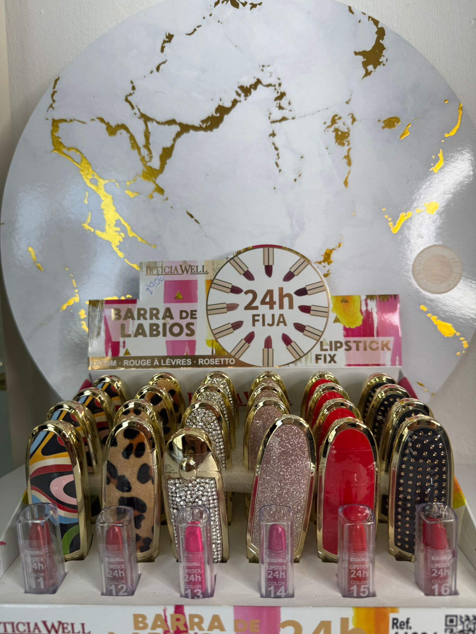 La imagen muestra el expositor de la Barra de Labios Matte Fija 24 Horas "Lip Fix" de Leticia Well, un producto cosmético diseñado para ofrecer color intenso y duradero en los labios.