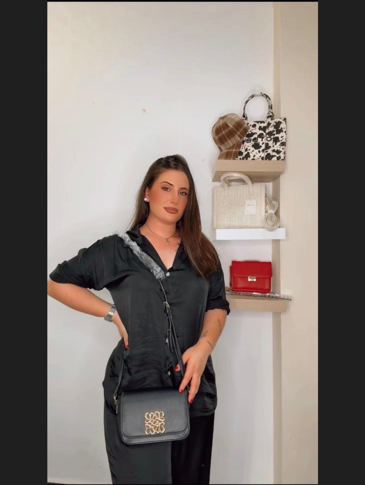 El bolso de la imagen es un bolso de hombro de color negro, con un diseño de solapa y un distintivo emblema dorado en la parte frontal.