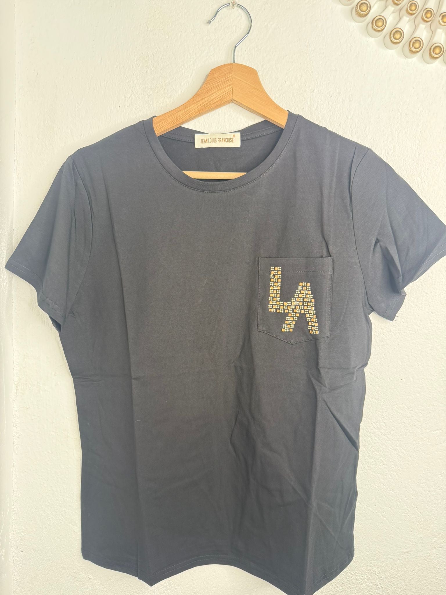 La imagen muestra una camiseta de manga corta de color blanco. La prenda tiene un cuello redondo y un bolsillo en el lado izquierdo del pecho. El bolsillo está adornado con las letras "LA" formadas por pequeños apliques brillantes, similares a pedrería o tachuelas. La etiqueta en el cuello indica la marca "JEAN-LOUIS FRANCOISE".