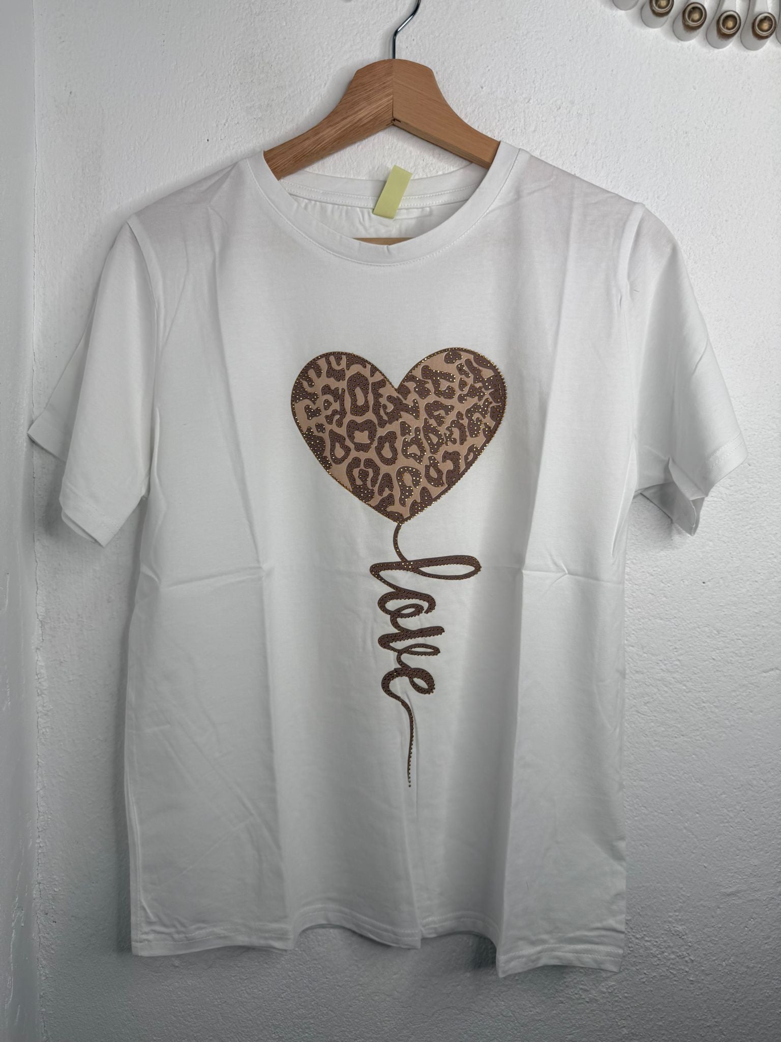 La camiseta es de color blanco, de manga corta y cuello redondo. En la parte central tiene un estampado de un corazón con un patrón de leopardo, y debajo de este, la palabra "love" escrita en una tipografía cursiva de color marrón.