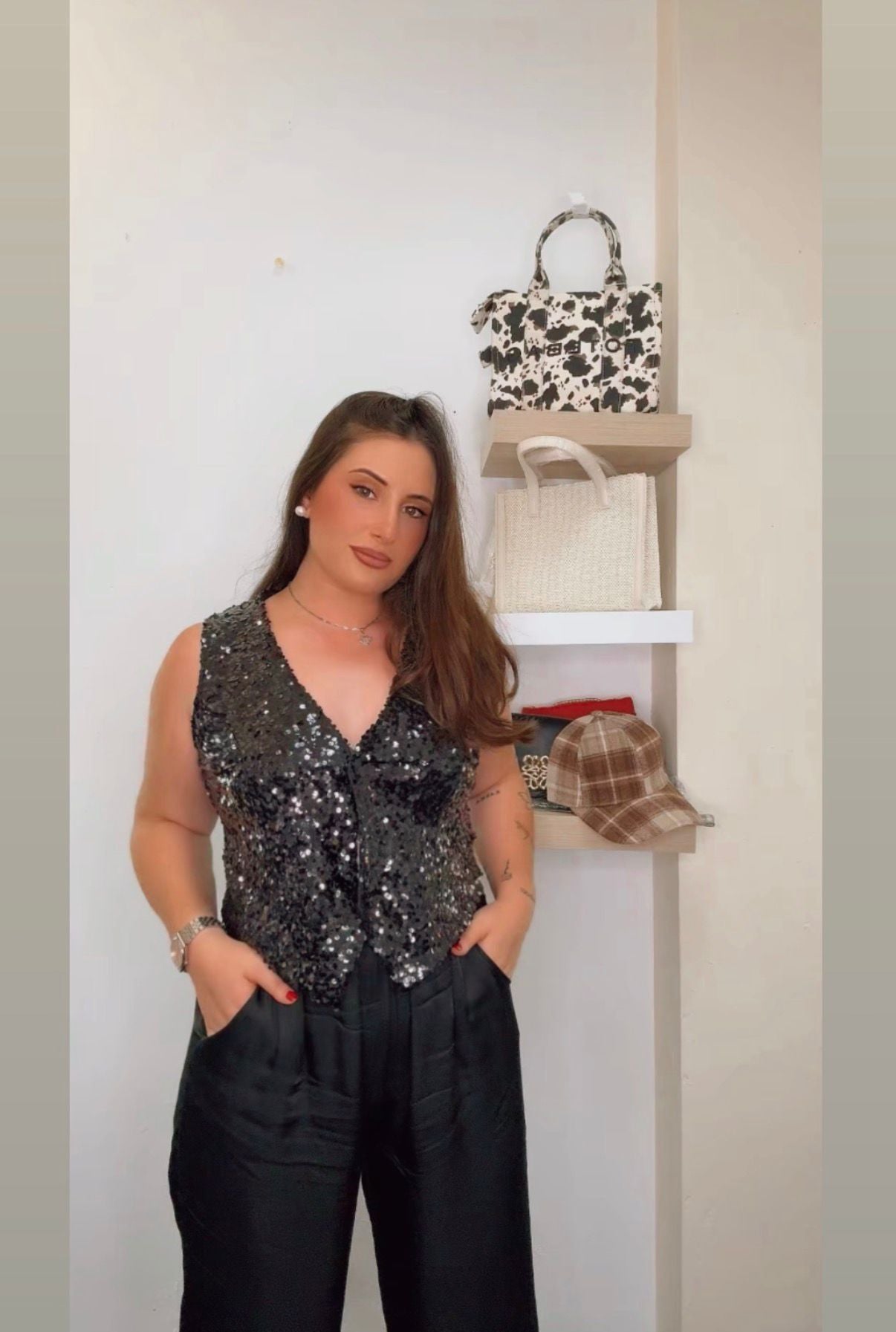 Este chaleco negro está confeccionado con un tejido cubierto de lentejuelas brillantes que aportan un toque sofisticado y festivo al look. Su diseño sin mangas y escote en pico realza la figura, mientras que el corte entallado crea una silueta elegante. Perfecto para combinar con pantalones de vestir o faldas en ocasiones especiales, cenas o eventos nocturnos, aportando glamour y estilo con cada movimiento.