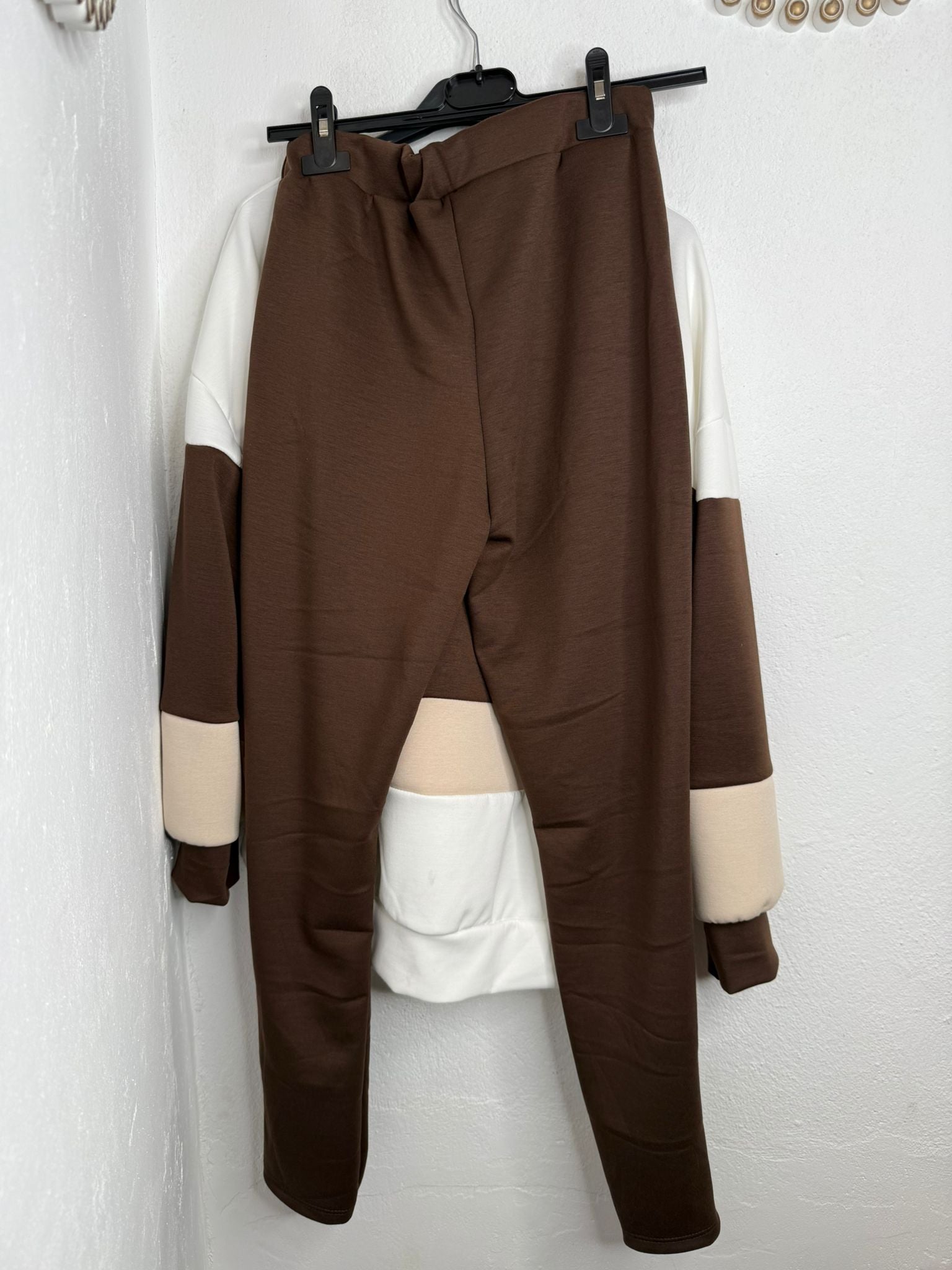 • Pantalón: Es de color marrón oscuro liso, a juego con la franja central de la sudadera.