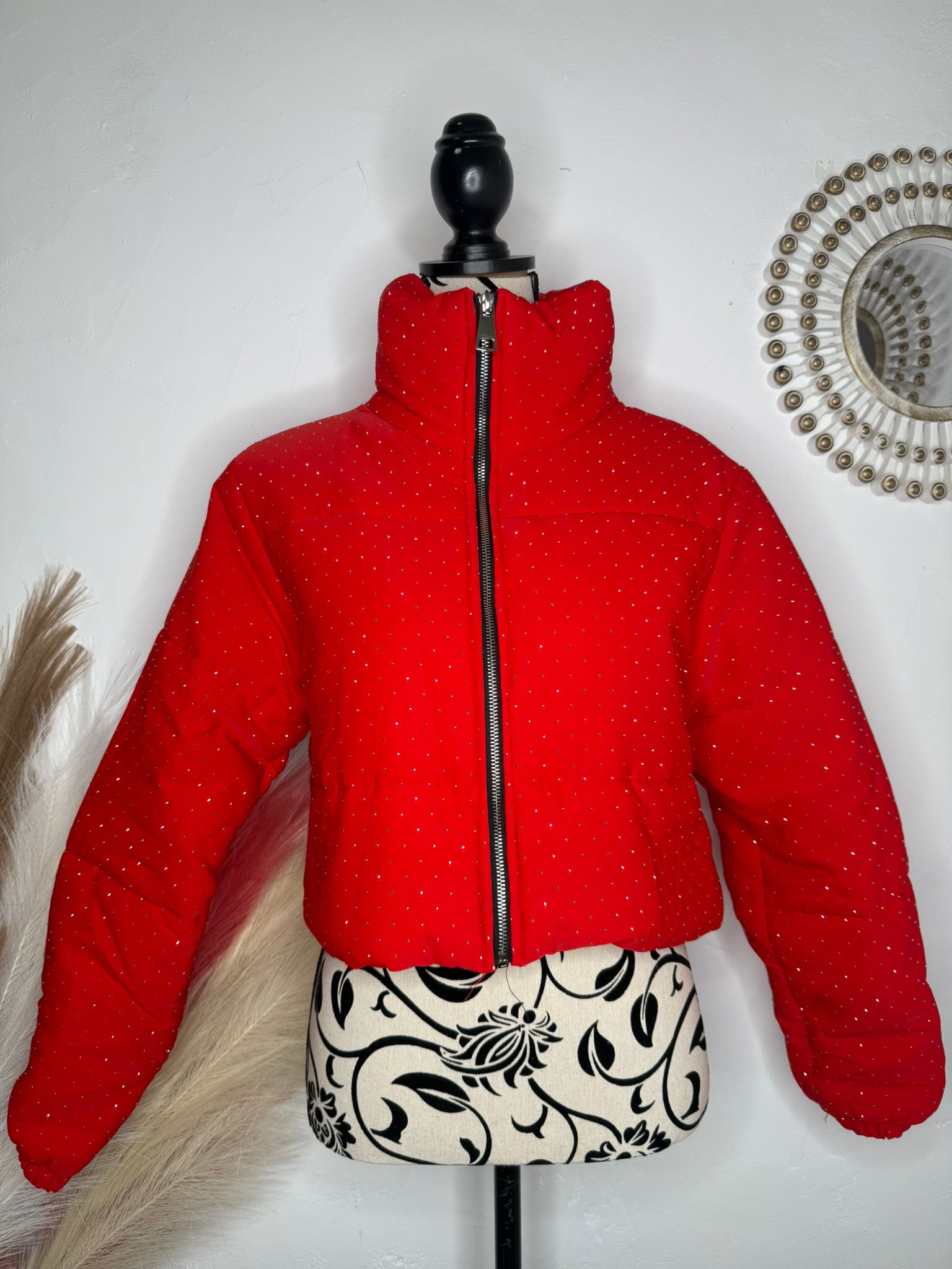 El tejido está decorado con pequeños puntos brillantes distribuidos uniformemente por toda la superficie, lo que le da un toque elegante y llamativo. La silueta es corta, de corte recto, y las mangas son largas con un acabado ligeramente abombado debido al relleno acolchado.