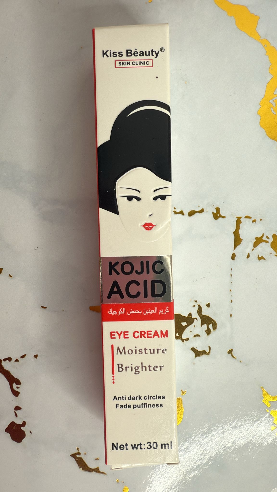 La crema para ojos Kiss Beauty con Ácido Kójico sirve para reducir ojeras, bolsas e hidratar la zona del contorno de ojos, además de mejorar la luminosidad y suavizar la textura de la pie.