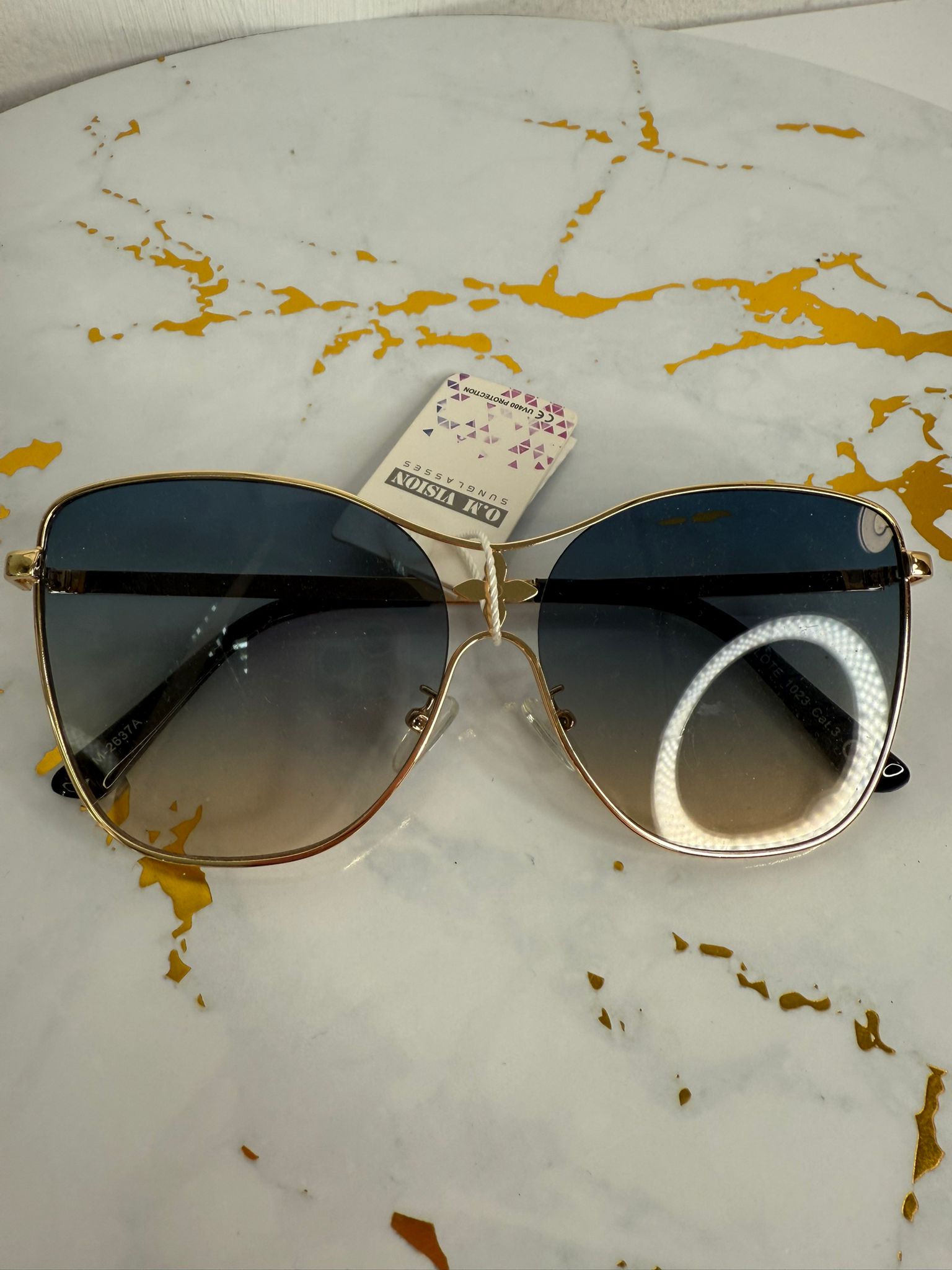 • Detalles: Se observa una etiqueta de la marca colgando de una de las patillas, indicando "O.M VISION SUNGLASSES" y también "UV PROTECTION.