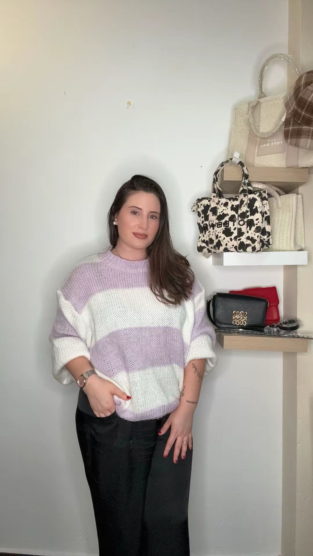 El jersey es un suéter de punto de gran tamaño con un patrón de rayas horizontales gruesas en color blanco y lila claro. Tiene un cuello redondo y mangas largas.