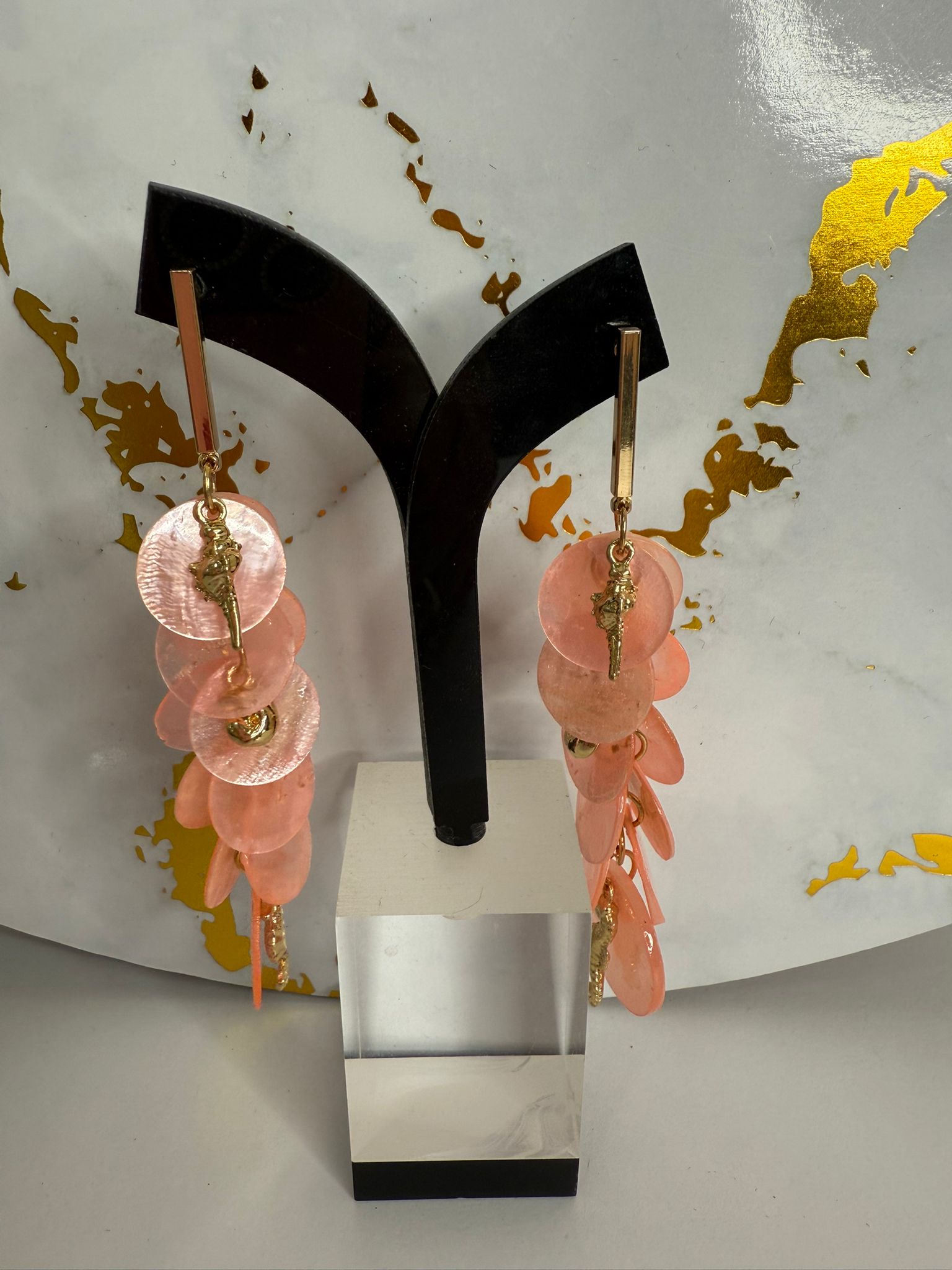 Los pendientes de la imagen son largos y colgantes, con un diseño que incorpora elementos de conchas o caparazones en tonos rosados o melocotón.