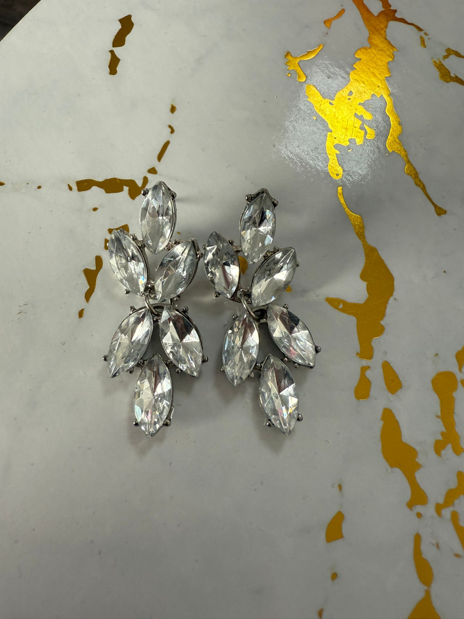 • Diseño: Pendientes de estilo "cluster" o racimo, compuestos por varias piedras de fantasía transparentes con forma de marquesa. Las piedras están engastadas en una base de metal plateado.