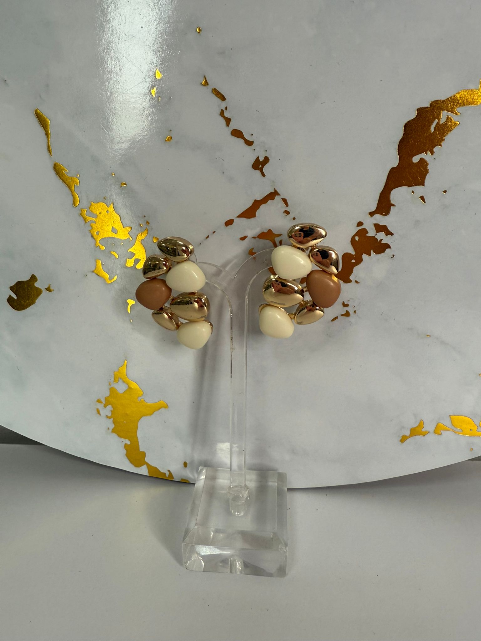 Los pendientes de la imagen son de tipo botón o "studs", caracterizados por estar compuestos por múltiples elementos decorativos pequeños y de forma irregular, que simulan ser guijarros o piedras pulidas. Presentan una combinación de colores neutros, incluyendo tonos beige claro o crema y un color marrón o terracota, intercalados con piezas metálicas doradas y pulidas que aportan brillo y contraste. Se sujetan directamente al lóbulo de la oreja sin colgar.