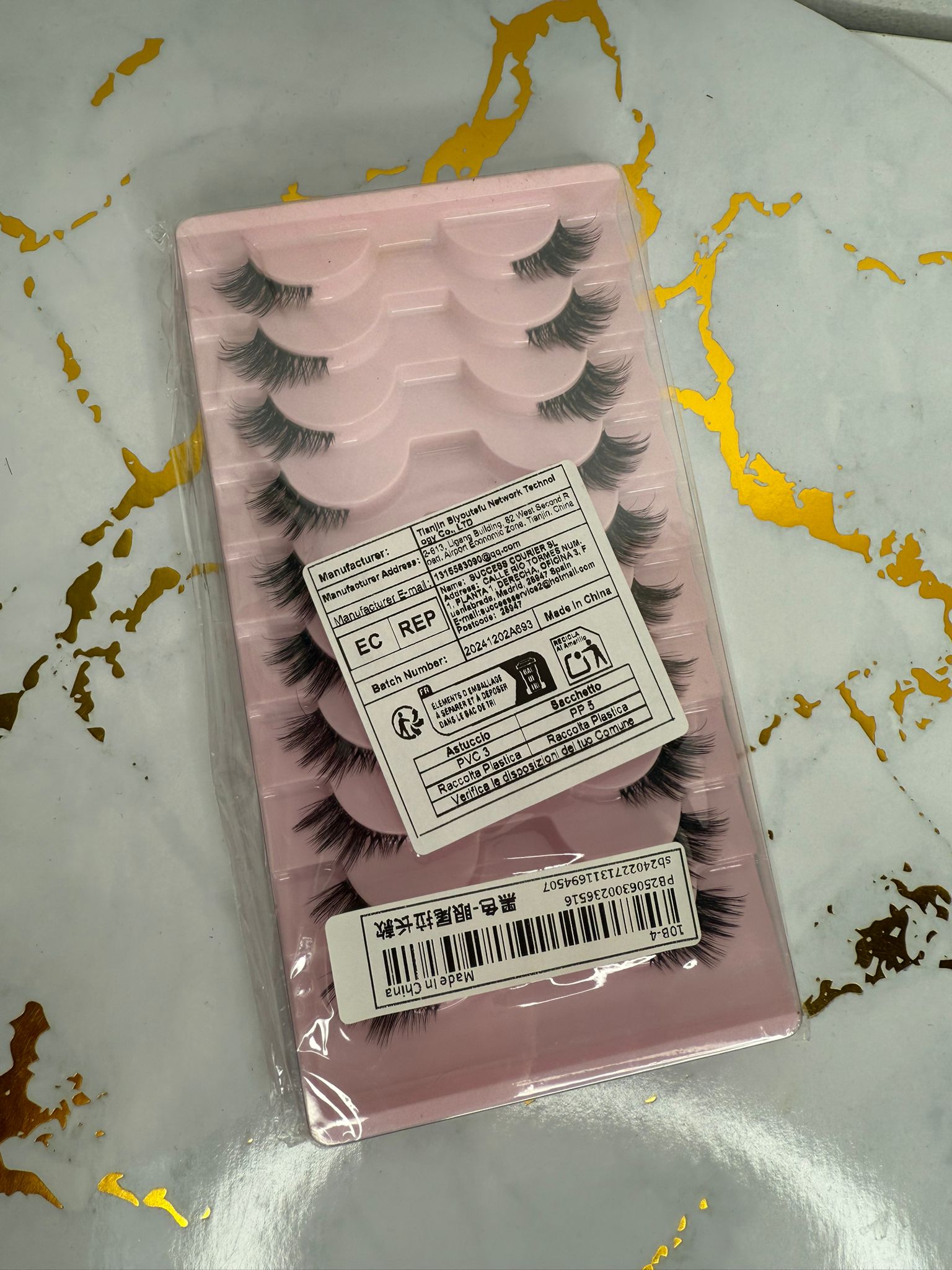 Estas pestañas postizas vienen en un set de varias unidades, presentadas en una bandeja rosa clara. Tienen un diseño voluminoso y curvado, con fibras largas y tupidas que aportan un efecto dramático y llamativo a la mirada. El estilo es de pestañas densas en la base y con puntas ligeramente más finas, lo que genera un acabado natural dentro de lo glamuroso.