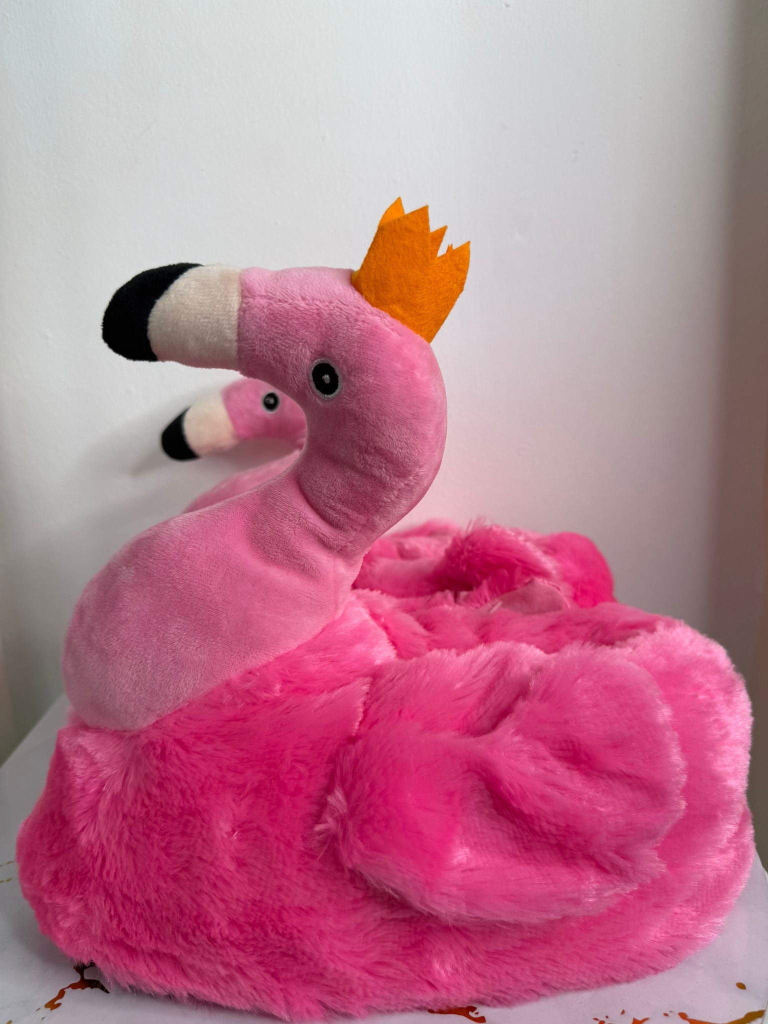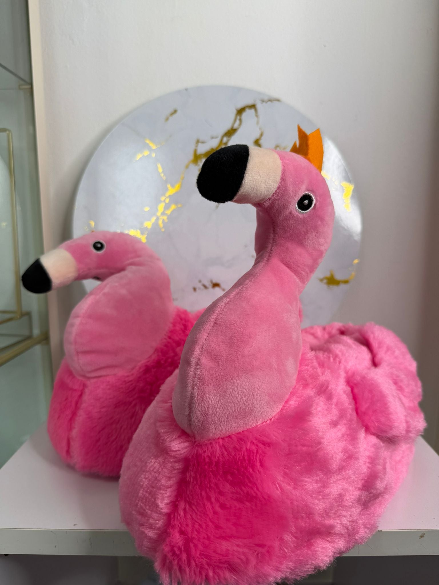 El producto en la imagen es un par de pantuflas de flamenco de peluche de color rosa.